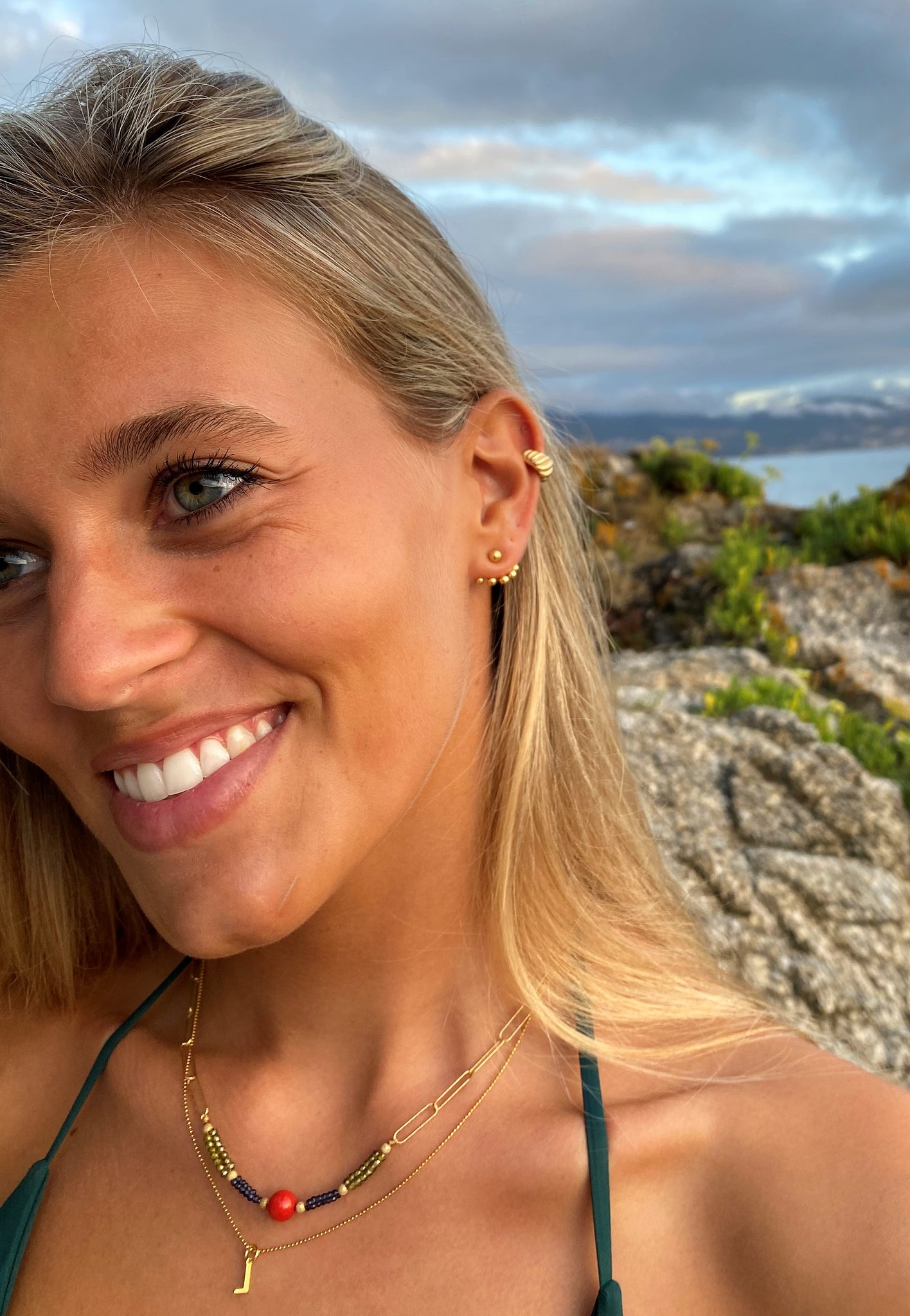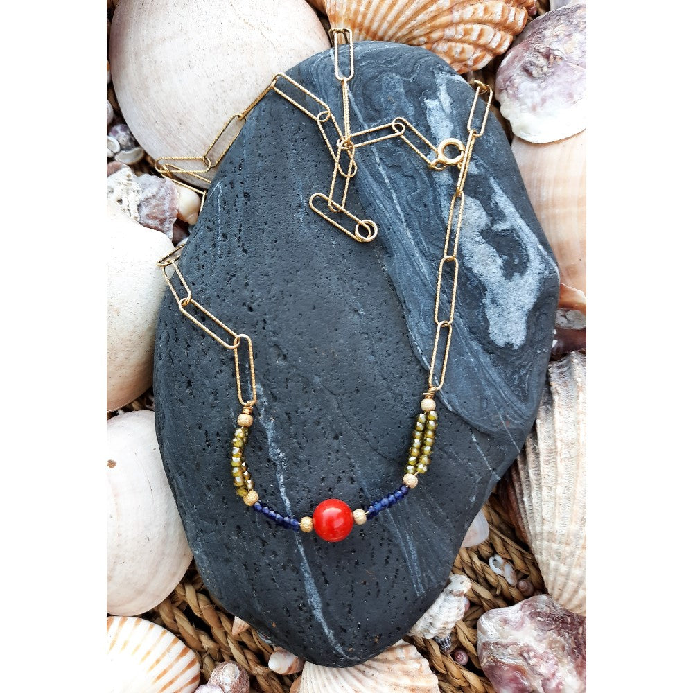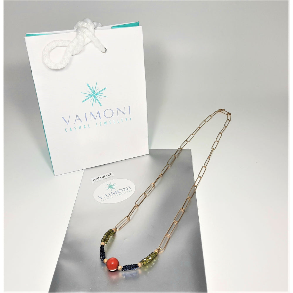 Collar realizado artesanalmente con cadena dorada diamantada de eslabones de plata de ley 925 y diversos abalorios. Diseño original VAIMONI. Largo 40 cm. (incluyendo colgante). Se incluyen bolsa de regalo y envío gratis.