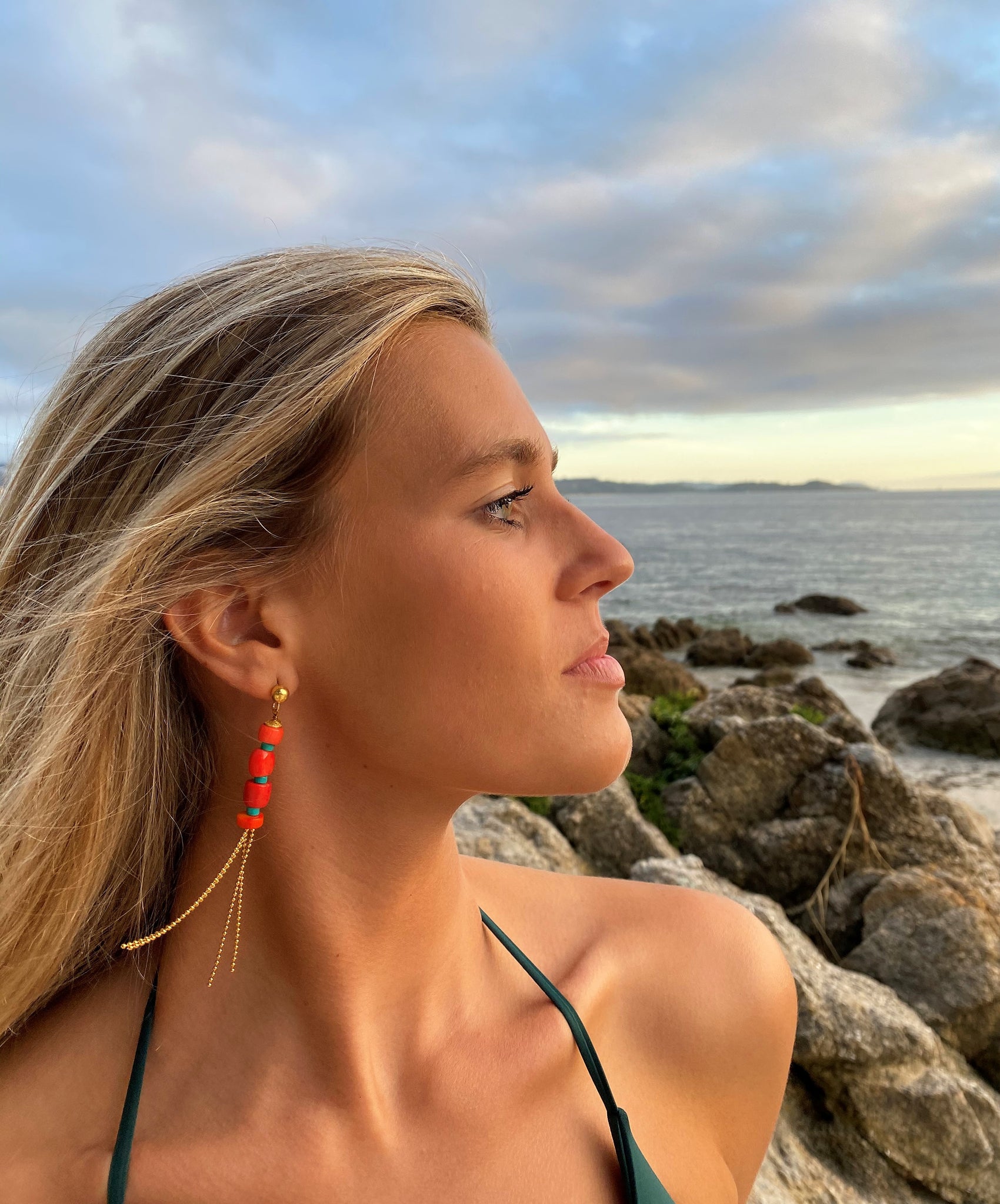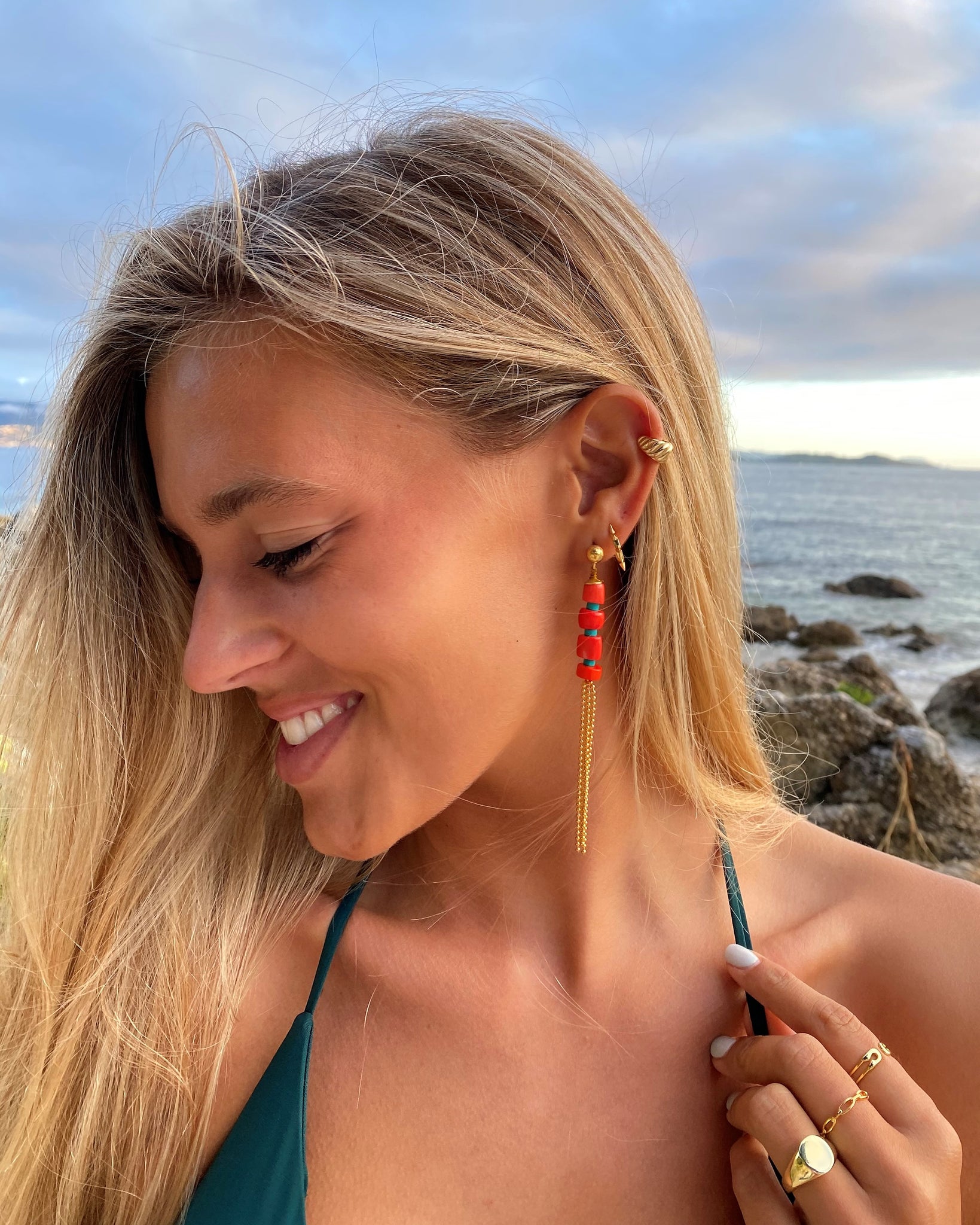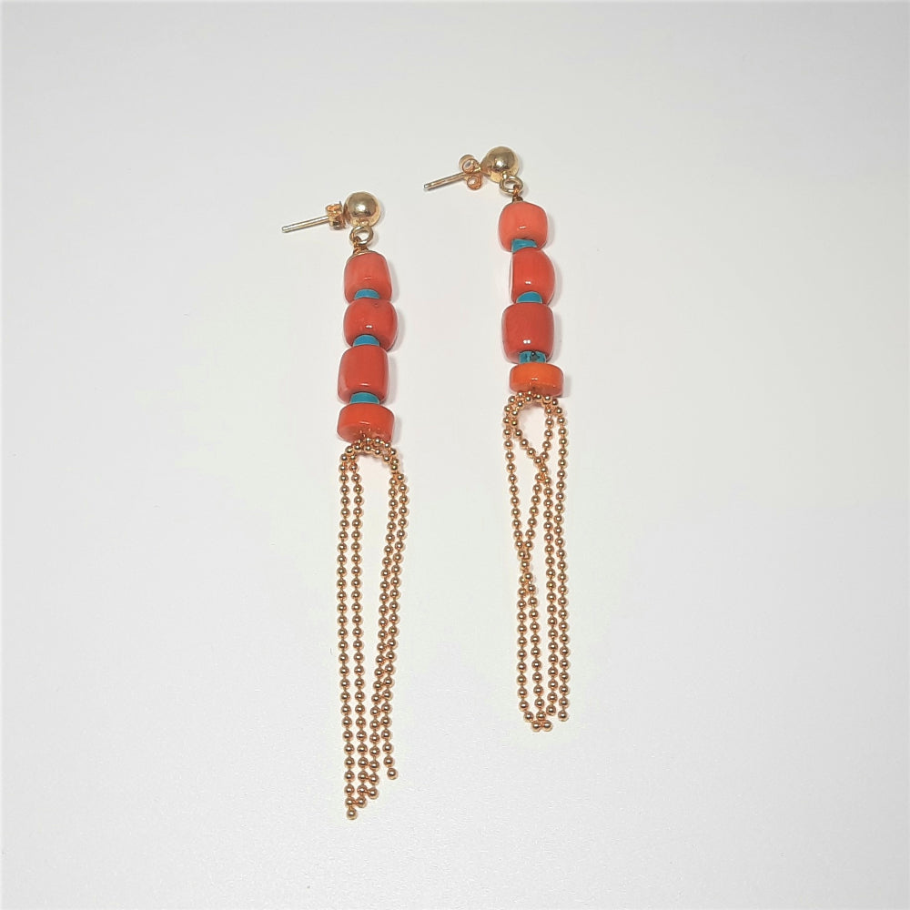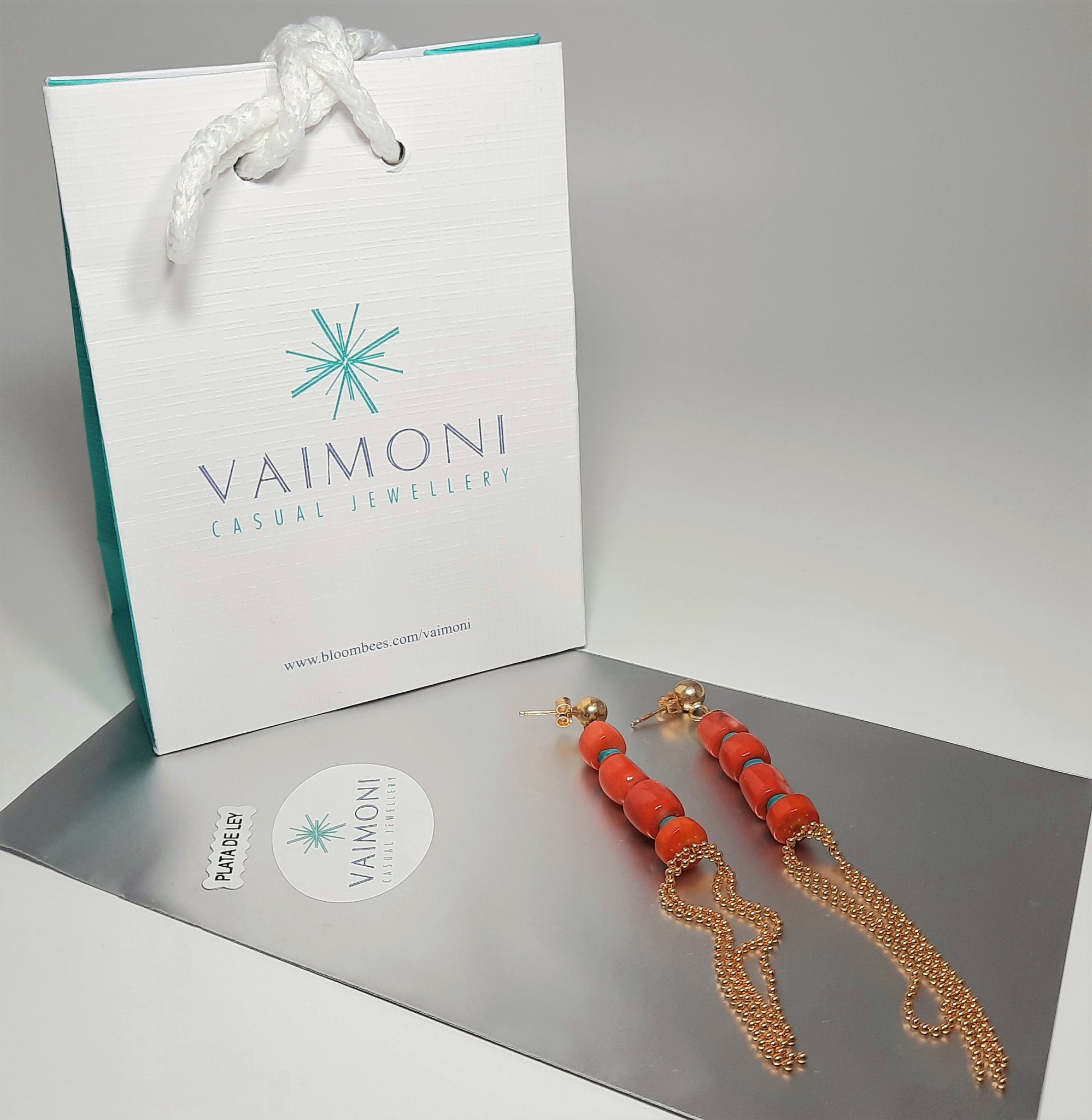 Par de pendientes realizado artesanalmente con diversos abalorios. Diseño original VAIMONI. Los cierres y cadena dorados son de plata de ley 925. Peso aprox:  8 gr.  unidad. Largo 8 cm. Bolsa de regalo y envío GRATIS.